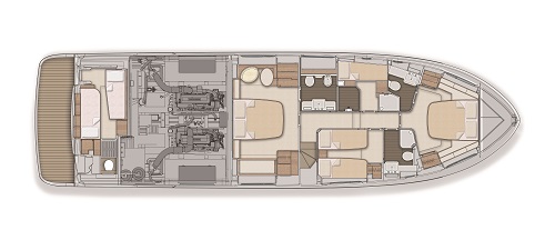 El propietario tiene su cabina en el piso inferior, un camarote a toda manga y con mucha luz y numerosos departamentos para estiba. Las cuatro cabinas de invitados también se dotan de amplios armarios y sus respectivos cuartos de baño.