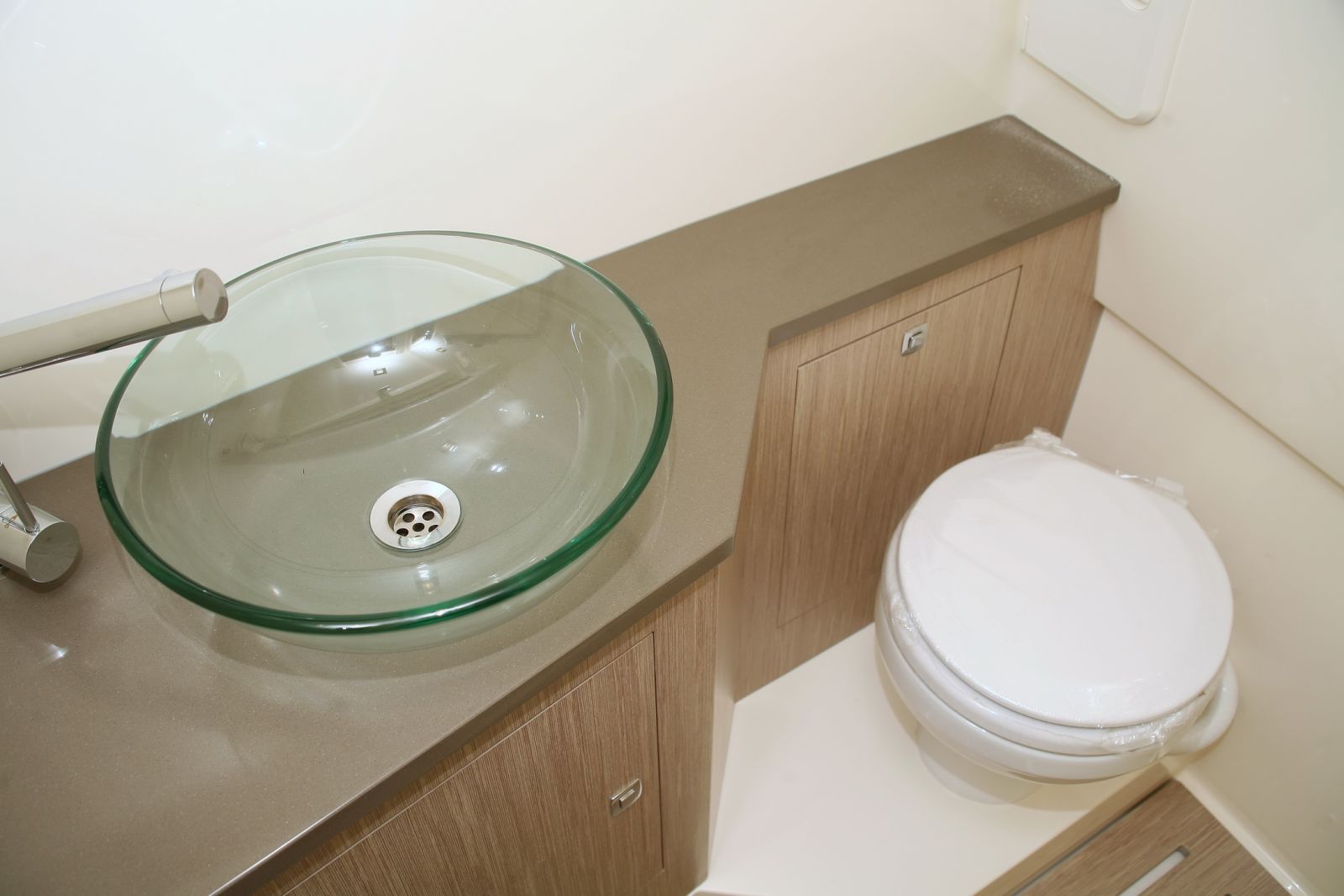 El espacio interior disponible es notable en un barco de esta tipología. Para conseguirlo se aprovecha todo el volumen de la consola de gobierno y una parte del existente debajo del solárium de proa. Esto permite formar una zona de descanso donde podrán pernoctar un par de personas y un cuarto de aseo separado donde hay un inodoro y un lavamanos cuya grifería extraíble permite su uso como ducha.