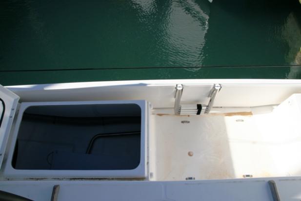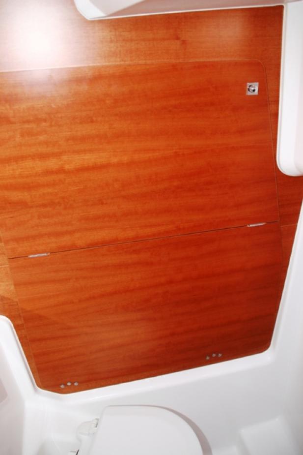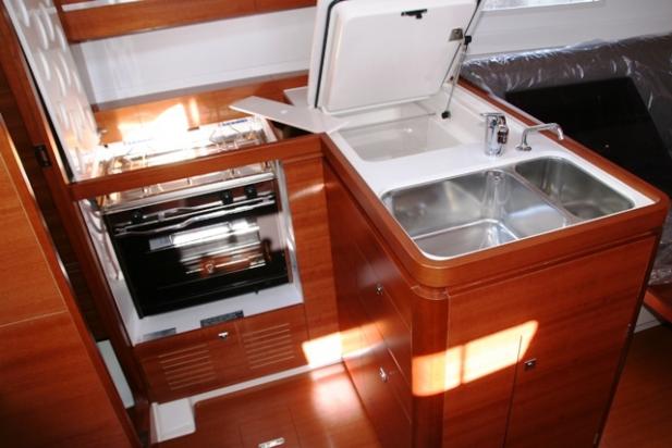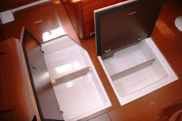 La disposición de los espacios que componen la acomodación es de lo más tradicional, pero con algunas soluciones prácticas y de agradecer para aquellos que disputen regatas. Destaca que en proa, además de ofrecer una cama doble centrada, la puerta de acceso es de doble ala, ofreciendo finalmente todo el espacio necesario para meter y sacar los habituales sacos de las velas y compensar así en parte el siempre molesto palo pasante. En el salón, existe otro gadget conocido pero no por ello menos interesante que es la posibilidad de hacer una cama extra bajando el ala de babor de la mesa central. Un espacio idóneo para el almacenamiento momentáneo de otra bolsa de velas. En la banda de Er., tras la mesa de cartas, está el acceso al lavabo que, ¡oh sorpresa! posee un registro en donde poner más bolsas o pertrechos además de ser un lugar para la estiba de pequeños objetos gracias a las bolsas de red colgantes. En la banda contraria está el camarote de popa con cama doble que se estira muy hacia popa. La cocina, bien dotada con los mínimos para alimentar a una familia de crucero, posee espacio adicional para la estiba en el suelo, con tapas dotadas de pistones de gas, algo de agradecer para no deslomarnos intentando encajar las tapas de los pañoles. Al lado, en el suelo, está la bomba para aspirar agua marina hacia el fregadero. Interesante y siempre útil reminiscencia de un pasado marinero que valoramos mucho en aras de un ahorro de agua potable. El resto de la estiba se ciñe a los armarios de los dos camarotes y las taquillas bajo las grandes aperturas de luz de las bandas, el asiento cajón de la mesa de cartas que posee un poco práctico sistema de cierre de la misma. El espacio bajo las cama de proa es un mega espacio para estiba y el de la cama de popa está ocupados por un gran depósito de gas-oil. Bajo los asientos del salón existen dos depósitos más con agua potable con bombas y compresores debidamente separados por una malla. Las tapas de todo el barco están dotadas de pistones de gas, lo que facilita mucho la vida a bordo.