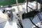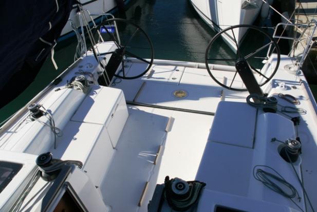 Una navegación muy placentera y con muy buenos registros que no lo hubieran sido tanto sin la buena disposición de una maniobra eficaz y fácilmente accionable como corresponde a un barco de crucero y, sobre todo, a uno de regatas. La maniobra es clara, con una escota de mayor “a la alemana”, es decir, que discurre por la botavara hasta la base del palo para luego ir reenviada por las dos bandas a sendos winches en las brazolas. Por supuesto los carros se triman desde la base del extremo del piano, muy bien surtido, por cierto, de mordazas TXS de Spinlock y unos winchs Harken 40, de la misma potencia que en el resto de los dispuestos en la bañera. El stay está literalmente arraigado en la roda por lo que el foque y/o genova no malgastan espacio, teniéndose más trapo hasta el puño de escota. Nos gusta mucho el largo carro de escota de la mayor que discurre por el suelo y la posición en la que debe estar el trimmer de la mayor para accionarlo milimétricamente a la racha. Aún nos gusta más la posibilidad de desartornillar unas palometas para poder dejar en el pantalán los dos cofres que conforman la mitad de la superficie de los asientos de cada banda. Esta práctica modularidad, ya vista hace algunos años en un 40 pies superventas en España, permite que el trimer del foque pueda trabajar a sus anchas en su winch y que, desde luego el trimer de mayor esté también mucho más cómodo. La superficie de la bañera gana enteros a la hora de navegar. Nos fijamos en las brazolas, con una buena superficie antiderrapante en el gelcoat y con una redondez compensaescora muy interesante. Llama la atención la ausencia de listones compensaescoras en el suelo de la bañera así como en los puestos de gobierno, posiciones bien medidas para la comodidad del timonel. Los bancos, no muy profundos, protegen suficientemente bien del mar.