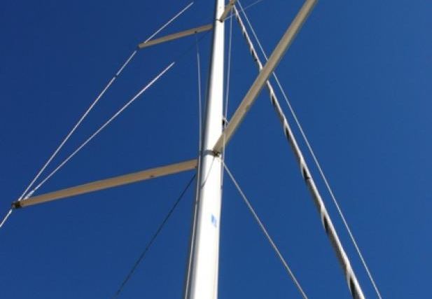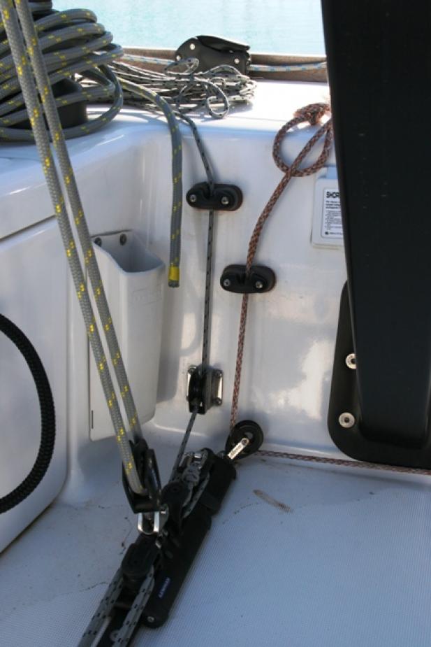 Nos seduce la solución adoptada para el trimado del back stay. Una bella desmultiplicación en cascada permite tensar el back desde las dos bandas. Además, la muy bien pensada bifurcación de la forma de “pata de gallo” del back, hace que los extremos estén muy separados y no molesten para nada al patrón en su desplazamiento rápido entre ruedas y a la familia e invitados en los momentos de acceso al mar en los fondeos.