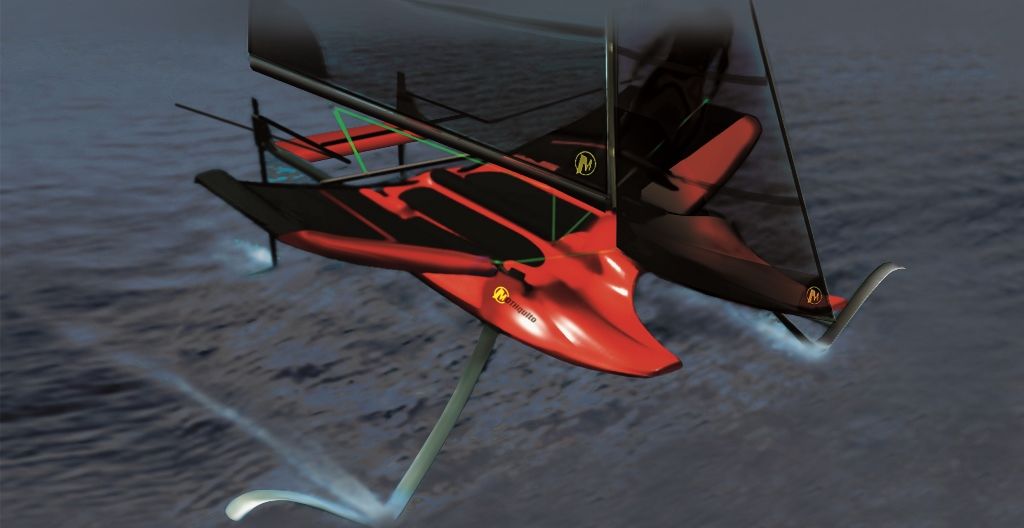 Otros casos de eficiencia son por ejemplo el caso del ya legendario Hydroptère, record del mundo de velocidad hasta el día en que el Vestas de Paul Larson lo rebasó en Namibia. En el Hydroptère, los planos de sustentación principales son perfiles alares dispuestos a 45º y en la manga máxima, otra vez una V pero con aumento de manga dinámica. Por lo tanto, el foil en “V” para nosotros es la clave y cuanto más alejado del centro (crujía) mayor será la manga dinámica y mayor el momento adrizante, lo que permitirá mayor superficie vélica para aumentar el potencial de velocidad del barco.