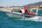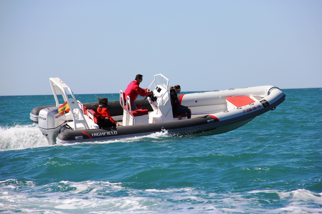 Una vez sabidas sus capacidades en lo que a prestaciones se refiere, iniciamos la sesión de viradas y contraviradas, cambios de régimen, aceleraciones,… ¡Lo divertido! Constatamos un navegar suave. El casco tiene la forma de “V” bastante acentuada (24º) necesaria con lo que no hay brusquedades, sino todo lo contrario: dulzura en los amerizajes tras los “flights” que realizamos con un mar de fondo residual. Surfeamos las olas y la proa no pincha las olas en las bajadas gracias a los redanes que actúan bien. Las viradas en largo a alta velocidad son seguras y se percibe el agarre en cada uno de ellas conforme las vamos cerrando. Ni un ápice de cavitaciones y ventilaciones. La rigidez estructural que ofrece el aluminio contribuye al máximo aprovechamiento de la potencia ya que apenas se disipa la fuerza propulsora con la sinuosidad del mar. Los ángulos de escora son seguros y recordemos que al estar en una semirrígida, los tubulares siempre ponen un límite haciendo sencillamente de tope con el agua. En navegación rectilínea la parte trasera delos mismos no tocan el agua con lo que se evita un rozamiento innecesario.