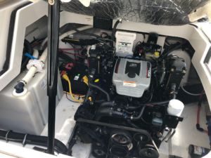 Esta unidad, de un solo propietario previo, está dotada de un motor de 300 caballos de potencia con transmisión de cola. Su mantenimiento siempre se ha hecho en los plazos estipulados y de manera completa por un mismo servicio técnico oficial. El motor solo tiene 160 horas de uso, lo cual ye es de por si, muy interesante. Es un Mercury que es capaz de impulsar sus 2.600 kg a una velocidad máxima de casi 40 nudos. Puedes ver nuestro reciente test del mismo modelo, con arco portaradar como extra, AQUÍ.
