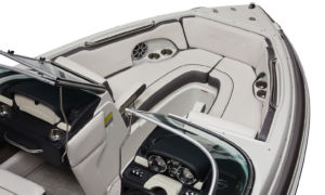 La proa, abierta o de estilo bow-rider, es especialmente atractiva para estar durante la navegación con un nivel de comodidad al estilo norteamericano. Nos referimos a más sujetavasos, reposabrazos, salidas de sonido HiFi, con unos tapizados y acolchados impecablemente bien realizados y resistentes.