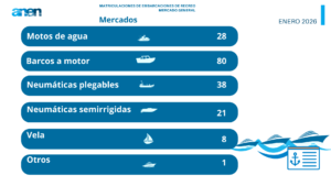 El mercado de embarcaciones de recreo en España registró 176 matriculaciones en enero de 2026 (incluidas motos de agua), lo que supone un descenso del 8,8% respecto al mismo mes de 2025, según los datos del Informe del Mercado de Embarcaciones de Recreo (enero 2026), elaborado por ANEN a partir de los registros facilitados por la Dirección General de la Marina Mercante.
