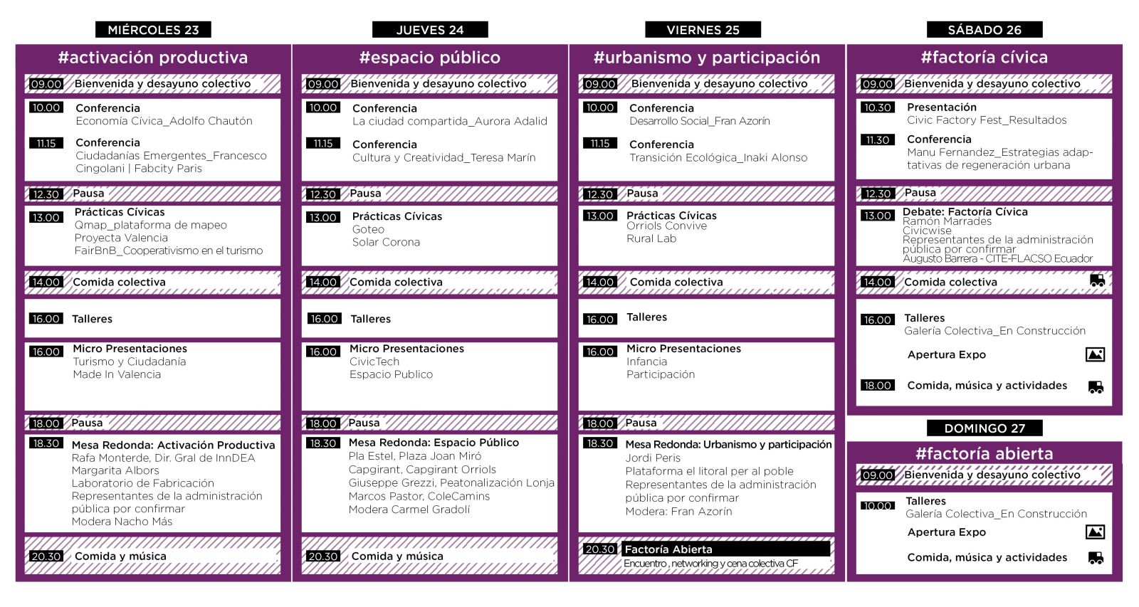 Cada tarde, a las 18:30h, se iniciarán mesas redondas donde intervendrán también representantes públicos del Ayuntamiento de València; está confirmada la participación de Jordi Peris, Concejal Delegado de Participación Ciudadana y Acción Vecinal. El foro alcanza su cénit el sábado, 26 de noviembre, con la presentación de los resultados del Civic Factory Fest La Marina. A partir de las 10:30h se darán a conocer las reflexiones, ideas y propuestas sobre el futuro de la Marina y de la ciudad de València que se han gestado tras tres semanas de trabajo colectivo entre los distintos agentes del territorio: vecinos, empresarios, profesionales, técnicos y representantes públicos.