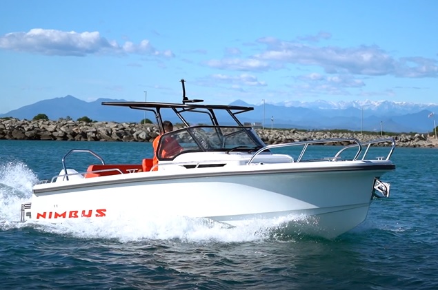 La T8 de Nimbus es un auténtico cañón. Una barca 100% deportiva. Deportiva con solvencia en el sentido de que gracias a su casco y a sus steps ofrece unas prestaciones muy potentes con los 300 caballos del Mercury Verado. La motorización adecuada que resulta ser la máxima admitida.