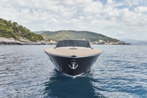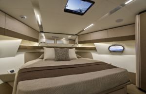 Siguiendo el diseño exterior, los interiores también son sencillos y funcionales, con una decoración que combina madera, cuero y tela, diseñada para conferir a la embarcación un ambiente acogedor y un aspecto elegante. Dos elementos lineales que recorren toda la eslora, desde la cocina hasta el camarote principal, aportan dinamismo al interior: la banda decorativa de cuero en las puertas de los armarios de pared y las dos tiras metálicas en el techo blanco que integran las luces.