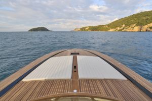 La proa también cuenta con una característica distintiva: una amplia colchoneta para tomar el sol, con compartimento de almacenamiento y portavasos, perfectamente integrada a la cubierta.