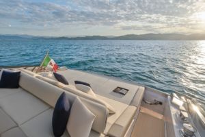 La sección de popa está ocupada casi en su totalidad por un gran solárium, uno de los elementos distintivos de la marca, con un pasillo en el lado de babor para acceder a la embarcación. El compartimento de 1.800 litros de volumen bajo el solárium es ideal para guardar juguetes acuáticos gracias al diseño del espejo de popa, que también ha permitido ampliar la bañera.