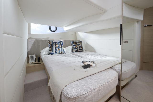La acomodación dista de ofrecer una distribución especial. Es indudablemente clásica con un camarote a proa grande, de cama doble centrada y bien surtido para la estiba de enseres personales y ropa con tocador, que posee un lavabo con ducha aparte de acceso privado pero que se comparte con el resto de los moradores de abordo que pueden estar también a sus anchas en el camarote doble transversal de popa, que ofrece dos camas individuales y que, opcionalmente, pueden disponer de un sistema convertible en una doble. En el lateral de babor, existe en esta estancia un sofá de 2 plazas junto a un mueble bajo con cajones. El volumen es amplio y placentero para la vida abordo con la privacidad necesaria. Este camarote situado en un nivel inferior es cerrable con una puerta.
