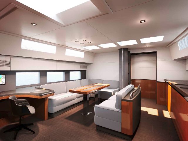 La distribución interior estándar se configura en tres grandes cabinas cada una con cuarto de baño propio. La tripulación puede contar con un camarote en proa, con acceso desde cubierta, y también existe la opción de añadir otra cabina con literas en el interior. En la parte central encontramos el salón/comedor con gran banco en “L”, mesa de alas abatibles y banco/isla central. Hacia popa se instala la mesa de cartas equipada con silla con ruedas y la cocina queda a lo largo de la estancia, directamente comunicada con el comedor.