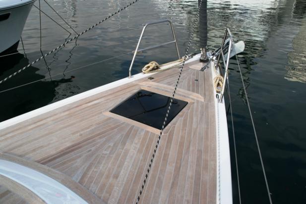 Tanto en la caseta como en la proa por delante el palo, las escotillas están enrasadas por lo que la superficie de paso es totalmente diáfana. El balcón es abierto. La totalidad de la superficie está forrada de teca, siendo un acierto que el “sikaflex” entre listones sea gris claro, para evitar así un sobrecalentamiento muy incómodo en caso de pisar descalzos la cubierta.