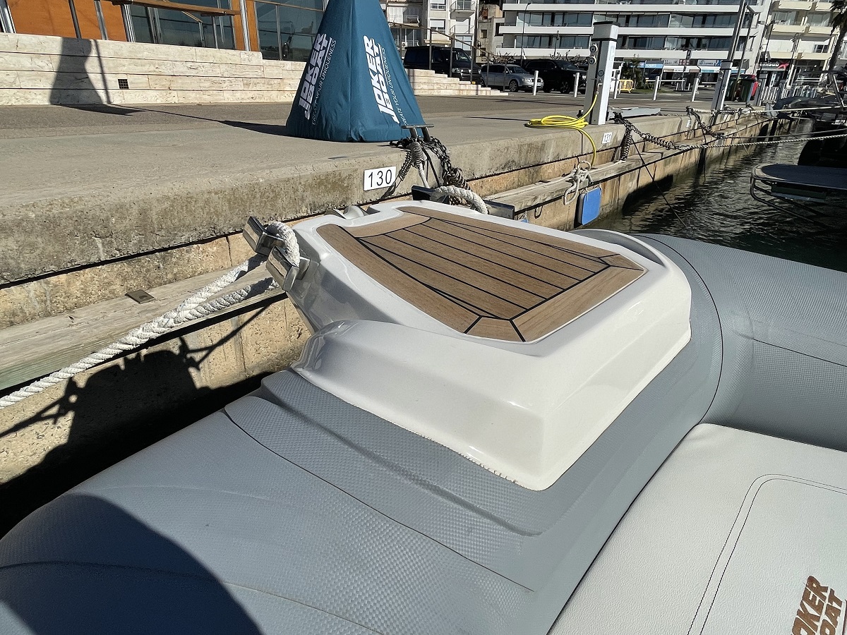 Lo decíamos al principio. La Clubman 22 Plus transpira un halo de calidad evidente. Llama la atención el doble cintón que protege los 6 tramos estancos de los tubulares que tienen un diámetro máximo de 54 cm y un mínimo de 46 y están realizados con neopreno-hypalón. Destacamos la roda perfiladísima en la que tiene insertada el orificio del sistema de fondeo con su ancla que funciona mediante molinete de cadena. El castillo de proa, debe decirse que luce unas bitas bonitas pero en nuestra opinión, mejor hubiera sido instalar una cornamusa para agilizar el nudo de amarre.