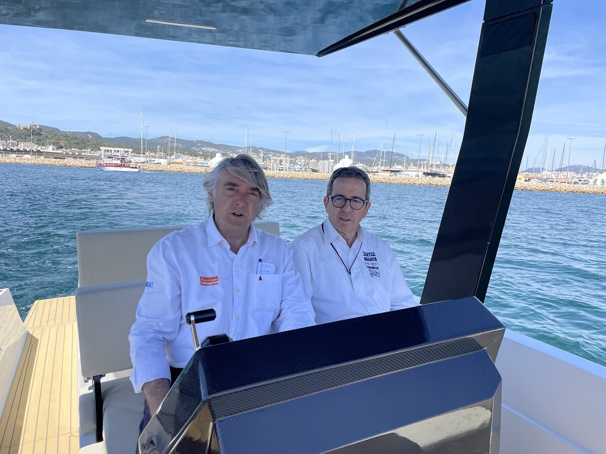 Los primeros momentos al navegar son algo desconcertantes. Solo se oye el mar y el viento. El chapoteo del mar en las amuras y con un poco más de velocidad el burbujeo de la generosa estela que dejamos por popa. ¡Nos tenemos aún que acostumbrar! Ricardo Masabeu y yo nos sentamos bien cómodos tras la bitácora del puesto de gobierno. En ella tenemos un display que, con unos interesantes gráficos, muy claros a la comprensión, podemos ver la entrega energética en el momento en kW, las r.p.m. del motor y la autonomía en cada uno de los regímenes a que sometemos el motor que, en esta unidad es de 20 kW, es decir, el equivalente aproximado a unos 26,8 Hp de combustión interna. En el Salón de Palma (PIBS) se limitó su potencia a 19,3 kW para ahorrar energía dada la gran cantidad de solicitudes de pruebas.