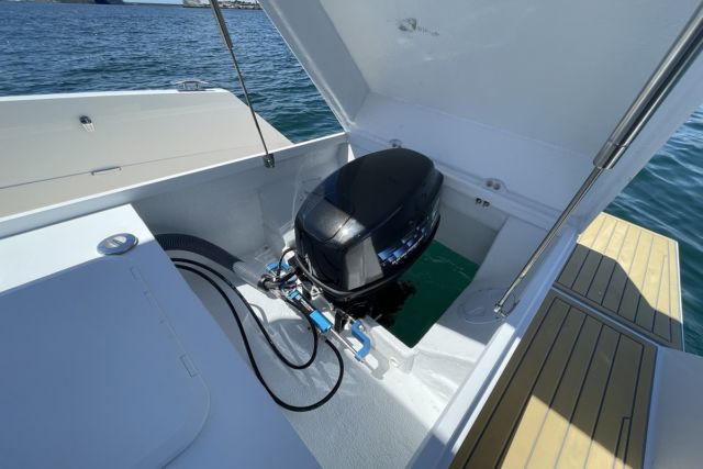 Comentar adicionalmente que, a pesar de no ver el espacio destinado a una nevera eléctrica o isotérmica, la marca las ofrece como opcionales, así como un bimini extra en textil (también fotovoltaico) algo tan interesante como que el hard-top pueda ser abatible, tener 40 L de agua dulce para la ducha en estos tiempos de reestriciones hídricas y, por si acaso, un par más de cornamusas escamoteables en el través.