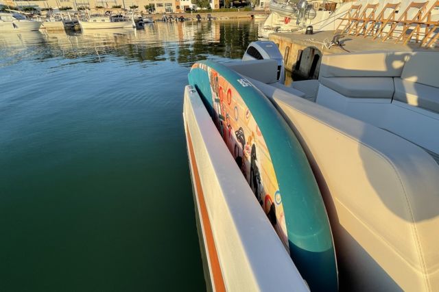 Creemos que ha sido enormemente creativo la disposición de un lugar específico para dos paddleboards y más aún el sistema para replegar y esconder la siempre molesta estructura tubular del bimini, que en este caso vemos que es muy grande alcanzando la totalidad de la superficie de la bañera.