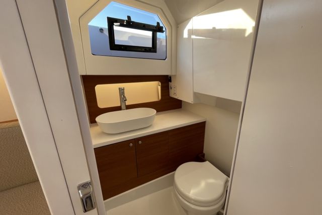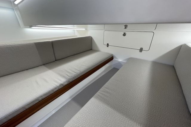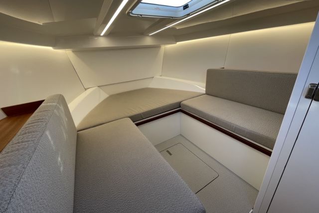 A todo ello se ha añadido, sin mermar la sensación de amplitud, un habitáculo WC muy coqueto, agradable, ventilado y cerrable para el lavabo que exhibe un inodoro vacuoflesh. La acomodación, tanto en proa como más a popa, exhibe multitud de espacios para la estiba general, de los cojines exteriores y suplementos como para la más personal si planificamos una salida de fin de semana o de varios días con la llegada del buen tiempo. El nivel de equipamiento y confort bajo techo lo permite.