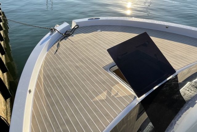 Hacia proa, desde la bañera hay que vencer el escalón correspondiente al puesto de gobierno ,y luego otro de la misma altura que nos lleva a una proa amplia, sin candeleros, que luce una escotilla de seguridad enrasada al nivel del piso y una atractiva orla/borda de dos dedos de altura. No echamos en falta la tradición de los candeleros, independientemente del tamaño que pudieran tener. Todo lo contrario, agradecemos la valentía de omitirlos en aras de un perfil mucho más estético y actual. No existe el asidero preceptivo en los costados, función que realiza bien el acristalado del parabrisas.
