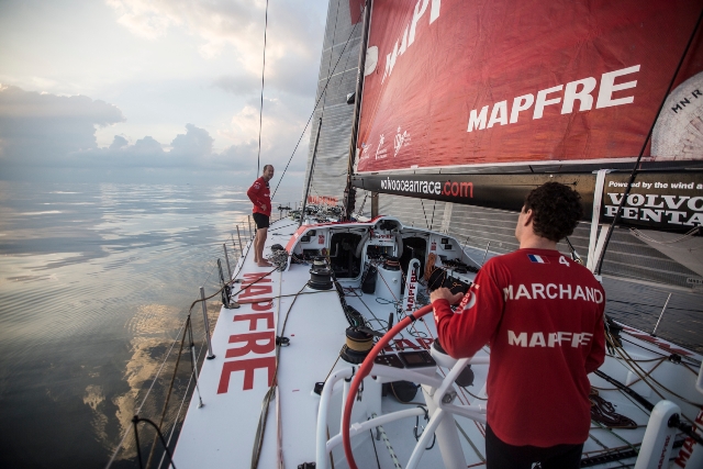 La compresión se debió al parón de viento entrada la noche, que obligó a Team Brunel y Team Abu Dhabi a tirar el ancla, seguidos por MAPFRE a primera hora de la madrugada. Team Alvimedica, que no lo hizo, retrocedió 1,5 millas en aproximadamente una hora y media. El viento era cero, y la corriente en contra de casi un nudo. Dongfeng Race Team no se libró del parón. “El efecto goma elástica volvió y nuevamente todos juntos peleando milla a milla. Dongfeng por su lado también está parado a unas 20 millas delante de nosotros. Por momentos no hay nada de viento y por otros 15 nudos de ceñida rumbo Sureste”, explicaba Fran Vignale, reportero a bordo de MAPFRE, esta mañana.